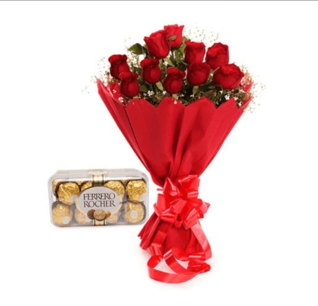 Bouquet 12 roses rouges avec son emballage cadeau accompagné de son Chocolat